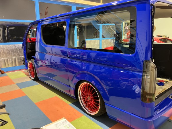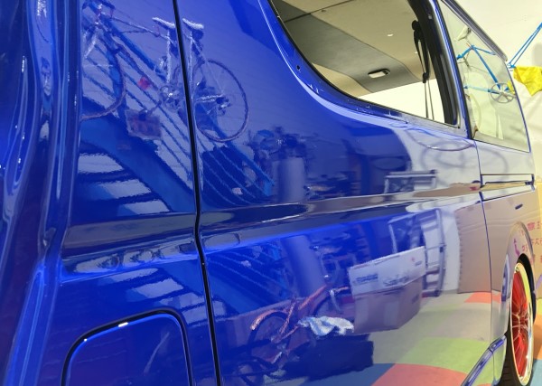 一つ一つパーツを塗りあげて、乾燥させながら組み付けへ。アウターハンドルをスムージングした左スライドドアは外からは開きません。