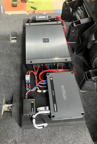 久しぶりに4ゲージケーブルを引き回したもんで、アンプボード下に格納出来なかった(笑)