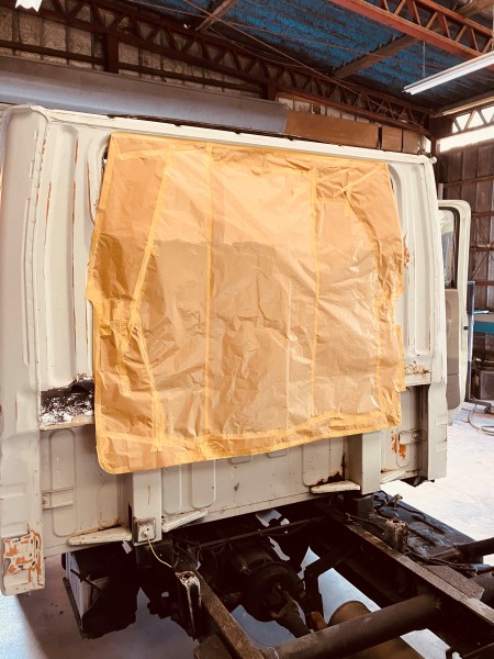 キャンターのバックパネルが錆だらけのため、錆をカットしながらパネルはめ殺しの寸法出し‼️