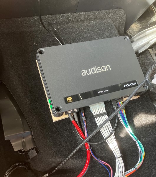 パッセンジャーシート下に、M8.14がいい塩梅に収まりそーなのでケーブルにストレスがないよう下駄をかませて収めます。