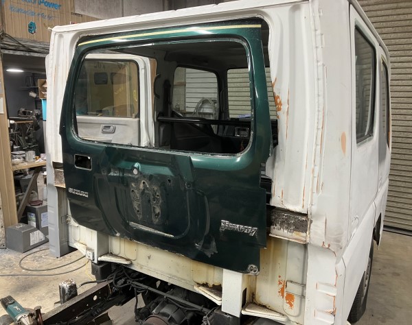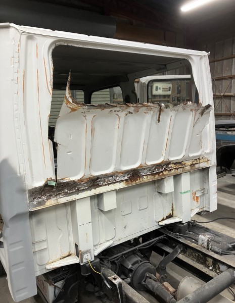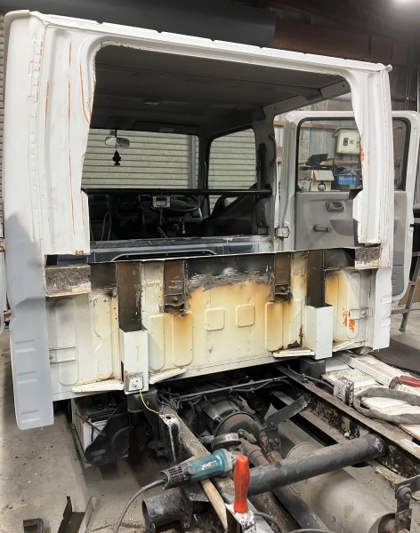 ストックガラスがハマらないほど受け側がグサグサになってしまい、にっちもさっちもいかない三菱キャンター。