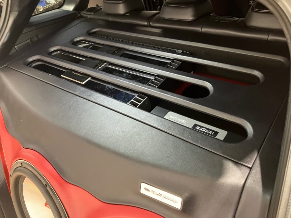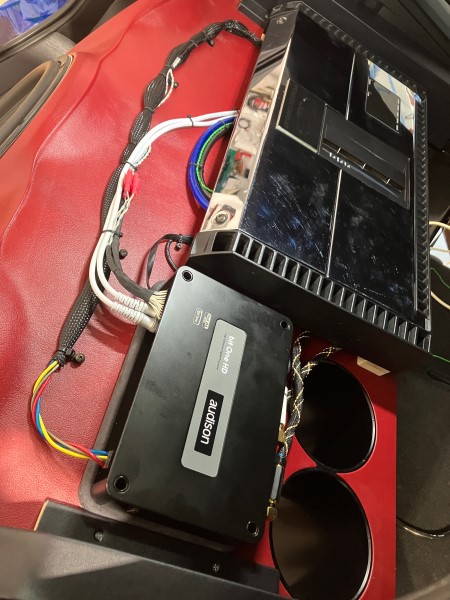 サブウーファーBOX上部にインストールしたアンプとDSP。φ130バスレフポートも備えてるので余白がまったくありません。