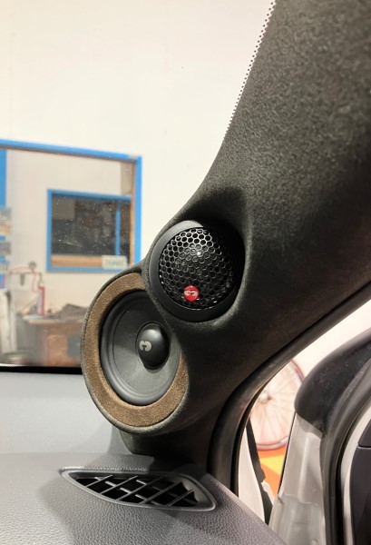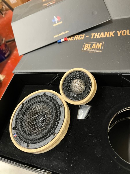 箱を開けるとメルシーって書いてあるブラムのスピーカー(3インチとtweeter)をAピラーに埋め込むため、リングを加工して段取りを進めてます。